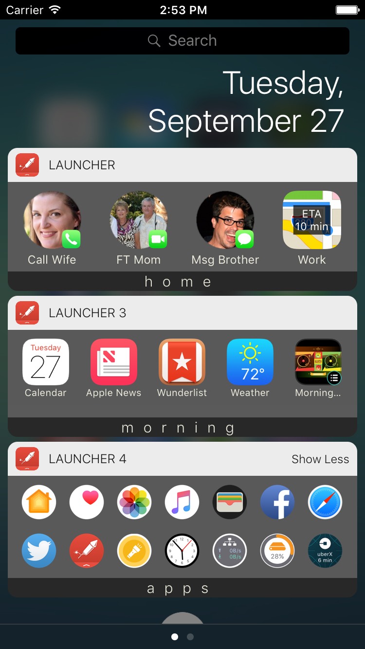 Multiple widgets greatly increases the number of launchers you can have in your Notification Center and helps the organization of your launchers. Each widget can be configured to show or hide based on time, day, and/or location, which is functionality never before seen in the App Store. Set up widgets for home, work, the gym, morning, weekdays, or whatever you can come up with so that you always have relevant launchers at your fingertips.