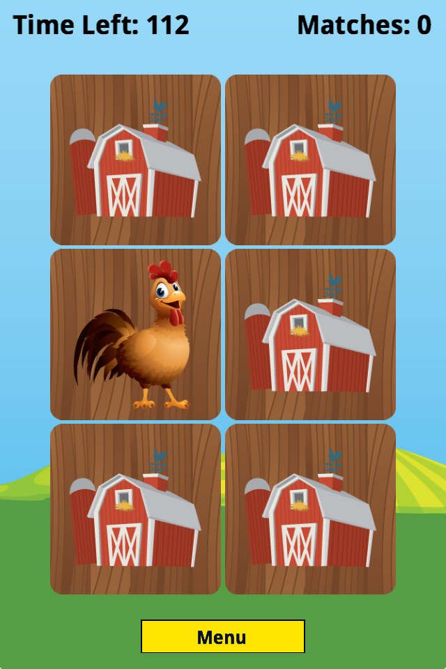There are three difficulty levels and five tile sets (6, 8, 12, 16, 20). Try to remember where all of the animals are so you can match them correctly. Preschool, toddlers, kindergarten kids, and young children will have so much fun finding the matching farm animals in the this educational game for children. The colorful farm animals in the game are: cow, pig, sheep, goat, horse, steer, chicken, goose, turkey and rooster. The bright colorful graphics and animal sounds will appeal to children of all ages. The app helps to develop recognition, concentration and memory. Every game has a random tile set of animals so it is always new and exciting to play.