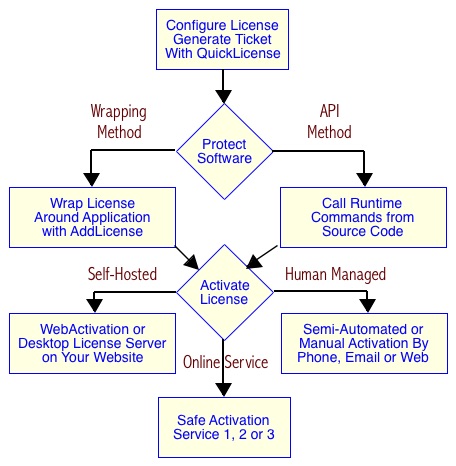 QuickLicense is used to define the type of license (Trial, Product, Try/Buy, Subscription or Floating), the licensing features (feature flags, pre-activation message, license release, restore, reset and suspend) and the activation process (manual, online, dongle or floating license server). A license can be applied to any kind of digital product (application, plugin, library, game or spreadsheet) using the AddLicense wrapping tool or programming API.