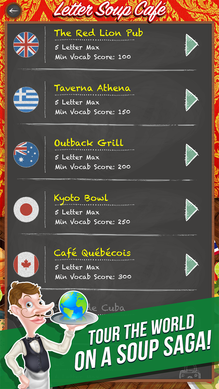Letter Soup Cafe includes 1000 levels of progressing difficulty that are spread across thirty level packs themed as cafes, each cafe representing a world cuisine. Players begin at the iconic Cafe Americana and end up traversing the globe, with the cleverest word buffs making it to distant outposts like the Afghan Tearom and Cafe Ethiopia. The game starts out easy with only three or four letters in each bowl of soup, but grows increasingly challenging by the time seven noodles are dished out in each serving.