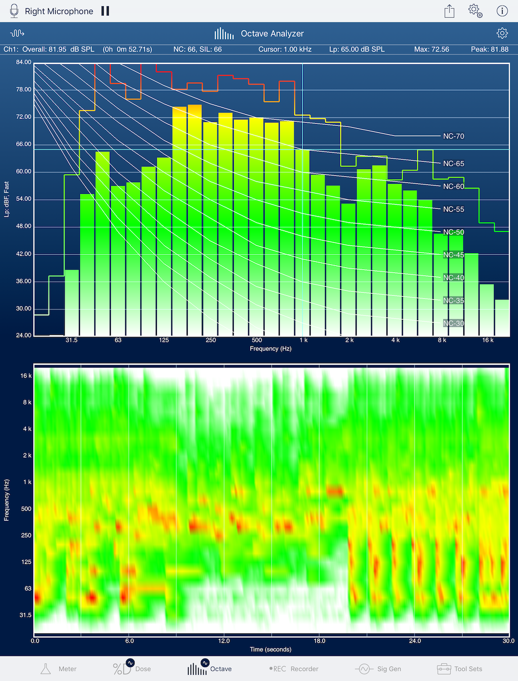 The SoundMeter Standard subscription includes access to more capable sound level meter and noise dosimeter tools, plus ongoing hardware support, such as periodically updated nominal microphone sensitivities for built-in microphones on Apple devices, updated nominal voltage sensitivities for select audio input devices, and automatic calibration for audio input devices that include built-in sensitivity information. The SoundMeter Pro subscription adds a whole or 1/3-octave real-time spectrum analyzer, a multi-channel data recorder, and a stereo signal generator. Additionally, data logging is added to the meter, dosimeter, and octave analyzer tools, and percentile-exceeded sound levels are added to the meter and octave analyzer tools.