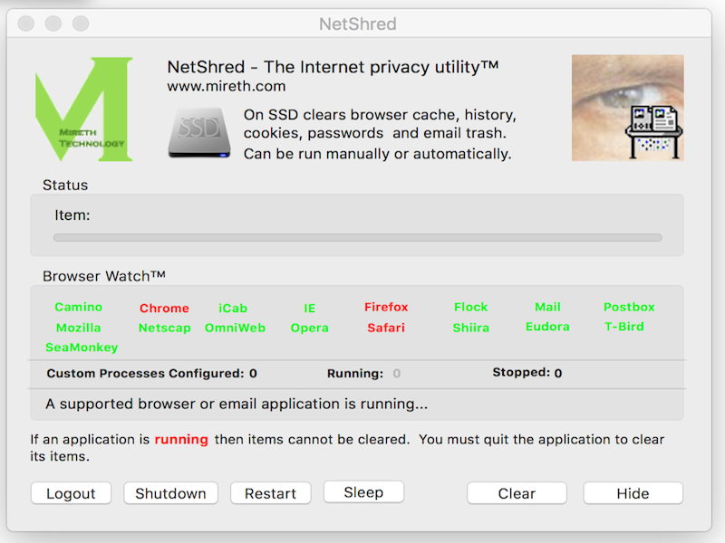Because internet privacy software can't be effective if it's not used, NetShred X is designed to run automatically, without user intervention. And since removing browser cache, history, email trash and junk can take some time, NetShred X is designed to run in the background, so using the app doesn't interfere with web browsing.
